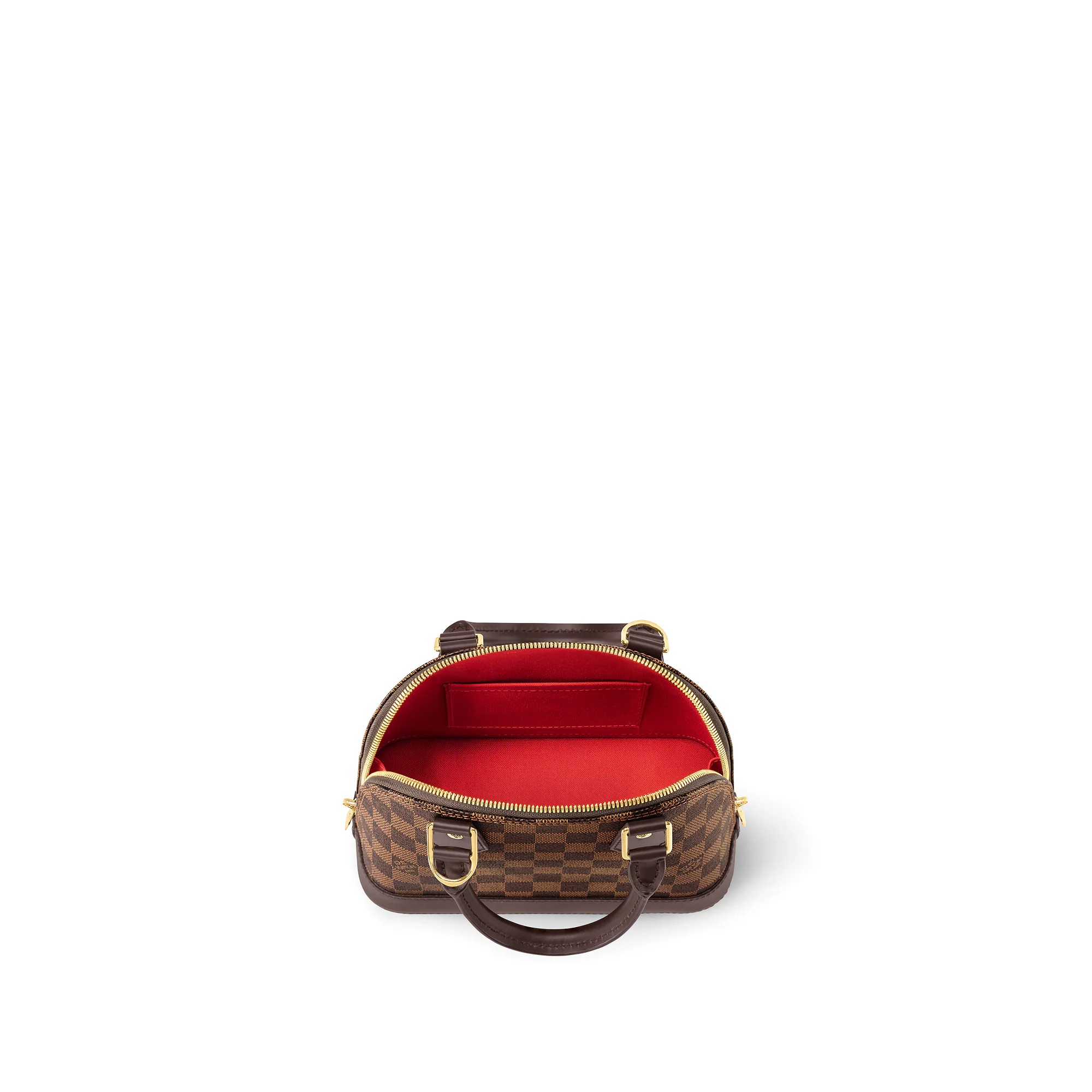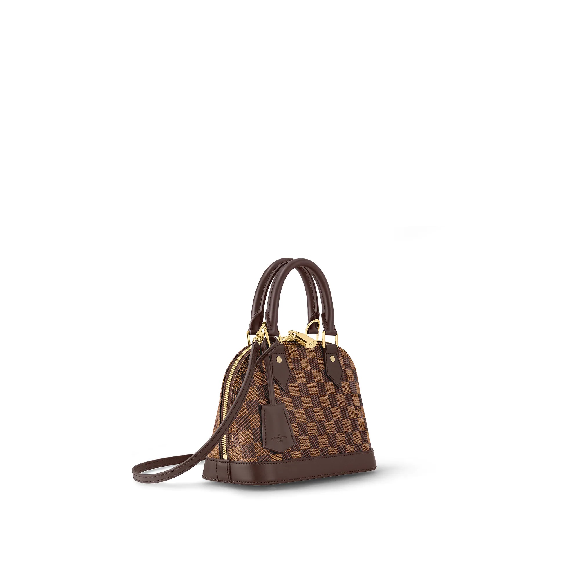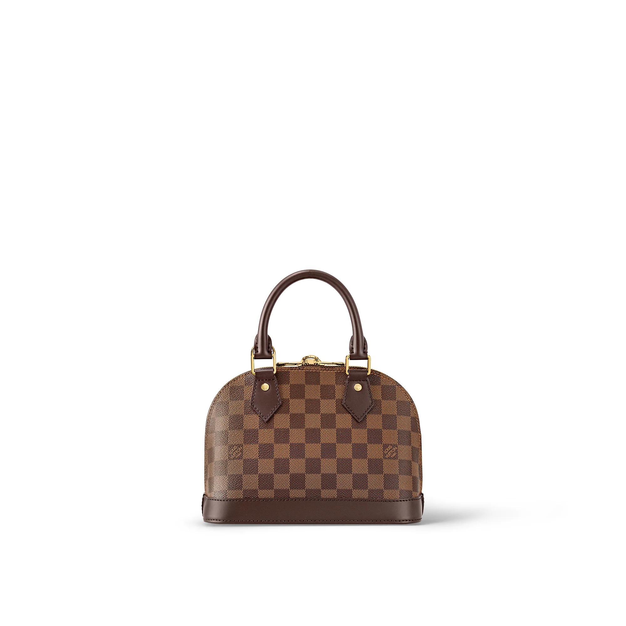 The Alma BB handbag traces its pedigree to the Art Deco original, introduced in 1934. Signature details impart a timeless elegance to this model made from graphic Damier Ebene canvas: note the golden padlock and keys, twin Toron handles and chic leather key bell. Equipped with a removable strap, this charming small bag is perfect for cross-body wear.
