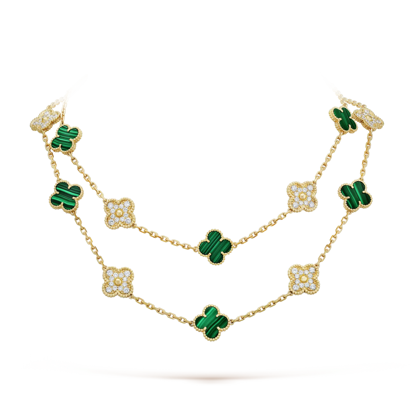 Vintage Alhambra long necklace, 20 motifs, 18K yellow gold, malachite, round diamonds; diamond quality DEF, IF to VVS.