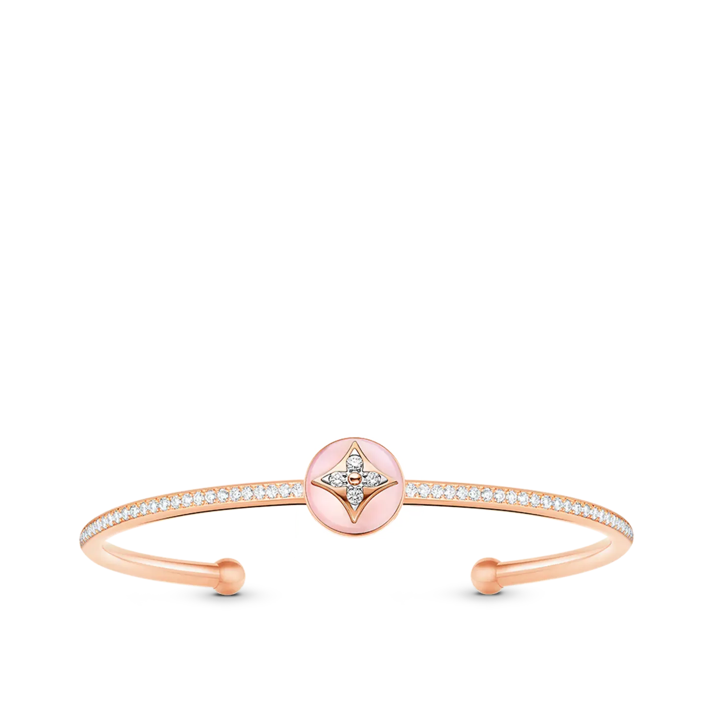 This dazzling edition of the B Blossom open bangle bracelet brings eye-catching shimmer to the wrist. Encrusted with diamond pavé, the 18-karat pink gold band features a hand-polished pink opal, centered with a Monogram Flower composed of four brilliant diamonds. Beautiful on its own, the bracelet is also stunning when mixed or matched with other jewels from the range.